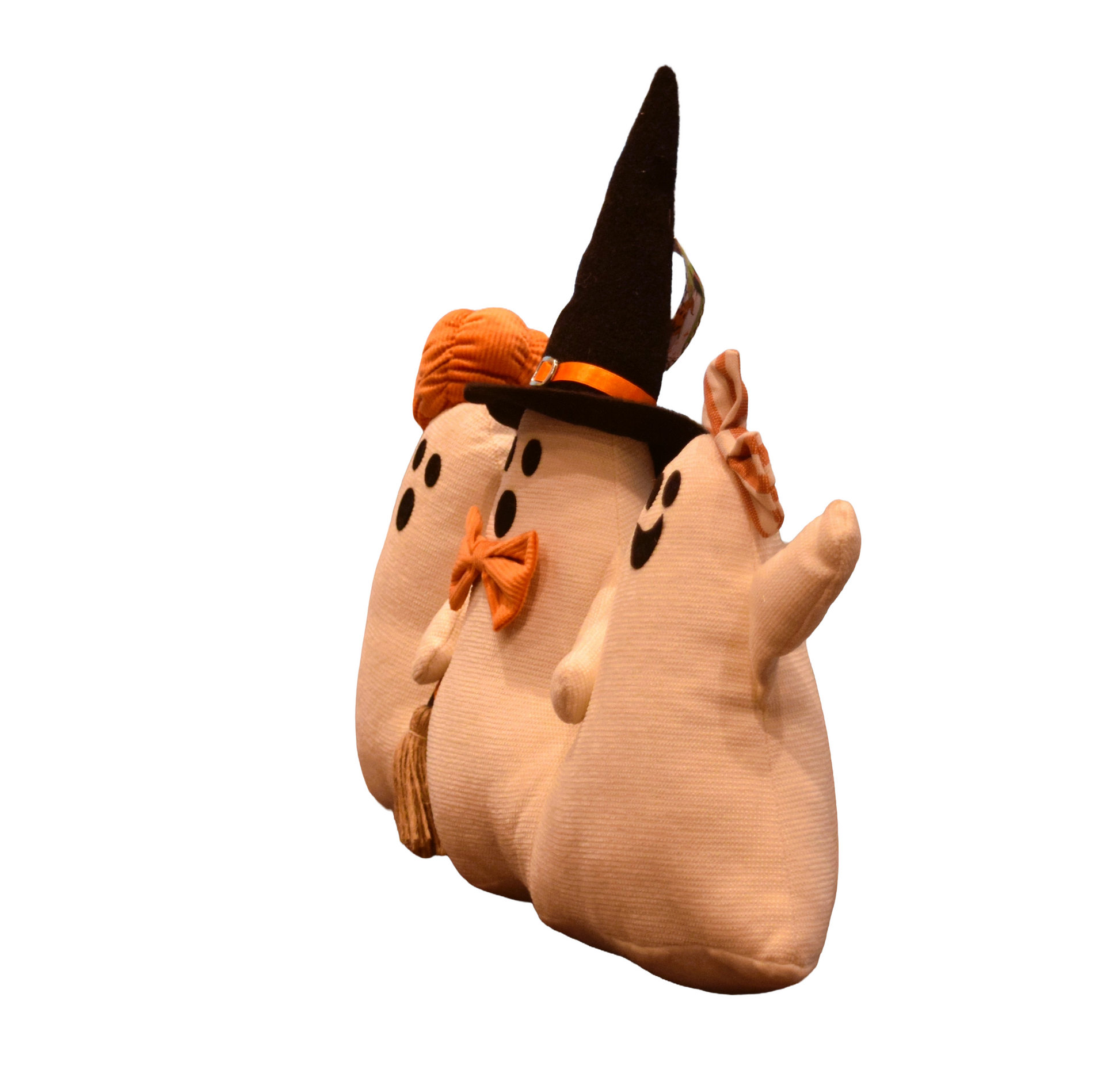 Design: Set of 3 plush ghosts with hats, bows, and broom